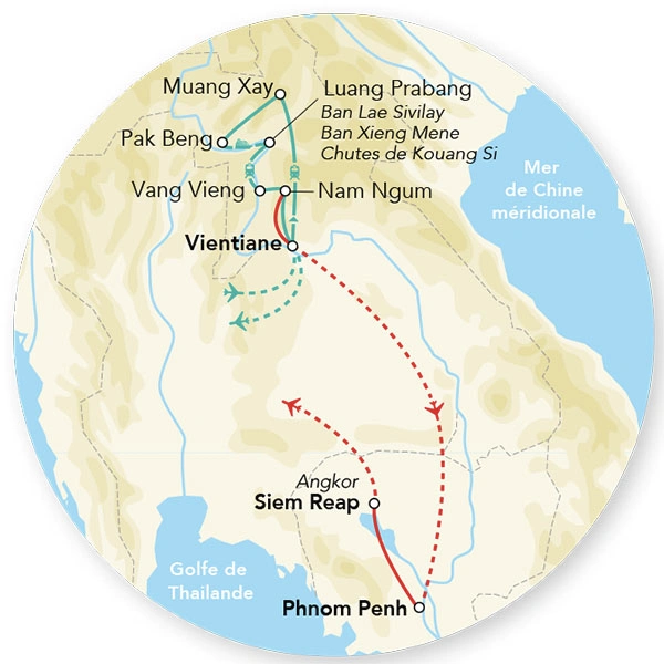 Embarquement matinal à bord d’un bateau joliment et confortablement aménagé pour un petit moment de détente. Profitez des premières lueurs de la journée pour une croisière (2h env.) au milieu de petits ilots caractéristiques du lac, et des stations de pêches flottantes faites de bambous et de filets. Départ pour Vientiane. En fonction de l’horaire de vol, transfert à l’aéroport et envol vers la France. (P.déj-Déj).